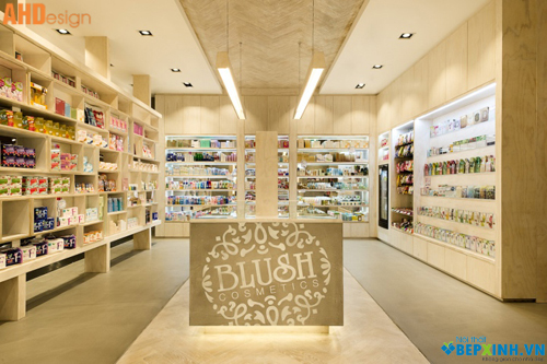 Nội thất shop mỹ phẩm Blush tại Australia Nội thất shop với bảng màu đơn giản của bê tông, ván ép, sàn và trần họa tiết xương cá. Shop mỹ