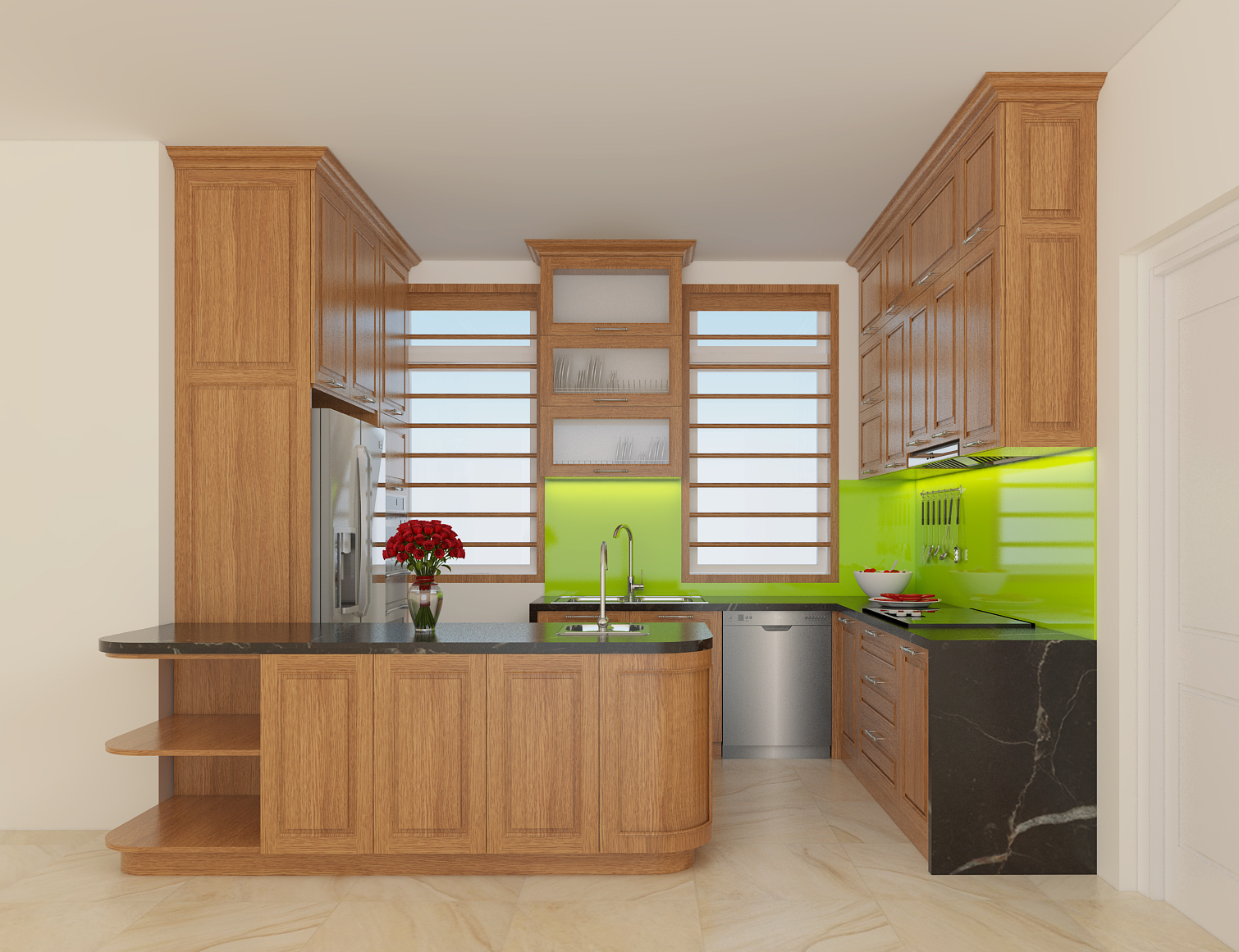 Phương án thiết kế mẫu tủ bếp cho nhà anh Đỗ Minh Sơn – Đồng Nai Tủ bếp được thiết kế dạng chữ L có bàn đảo ở giữa kết
