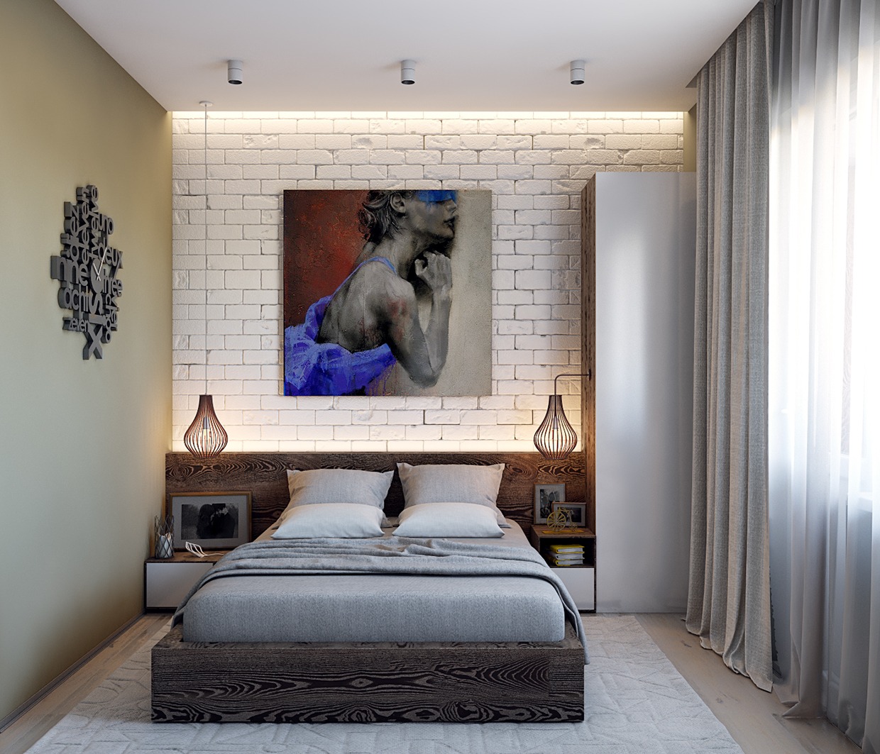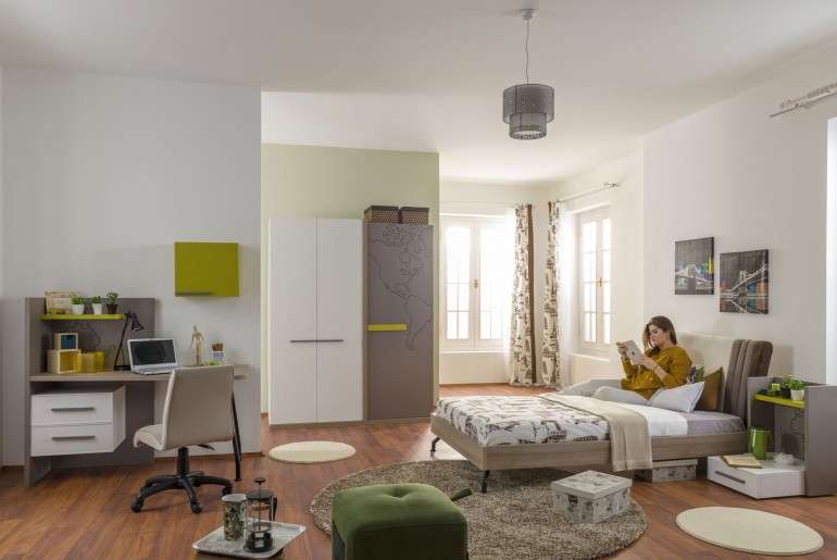 Nội thất phòng ngủ hiện đại cho bạn trẻ Căn phòng có tone màu trắng xám chủ đạo và tạo điểm nhấn bằng những mảng xanh cốm tươi trẻ, tham