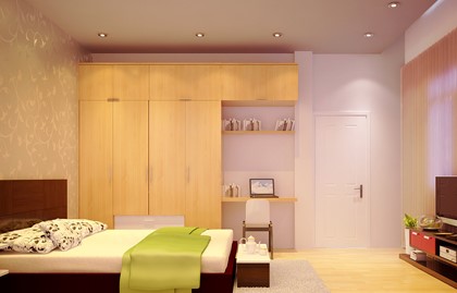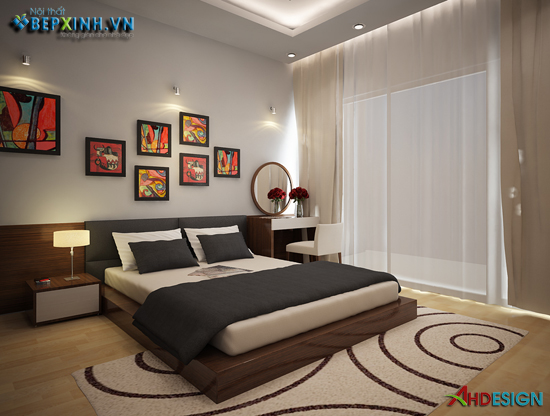 Nội thất phòng ngủ Master – nhà anh Hoàng Kích thước phòng ngủ master là 3,3mx4,2m được bố trí hài hòa với giường kích thước 1,6x2m, cùng tủ quần áo