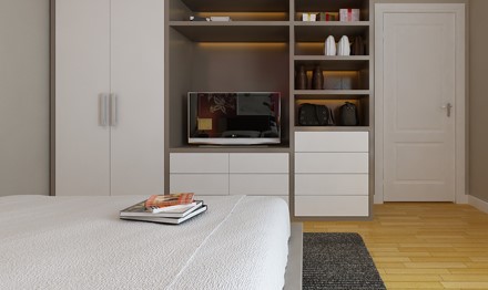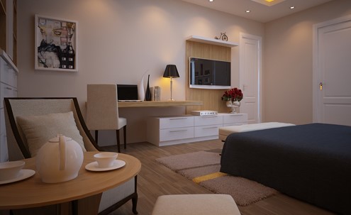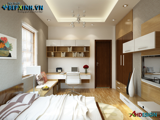 Nội thất phòng ngủ Master nhà chị Hường Thiết kế phòng ngủ 3mx3m, phòng ngủ master với kệ tivi, giá sách và bàn làm việc Tôi muốn nhờ KTS thiết