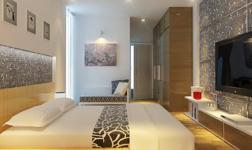 Thiết kế nội thất phòng ngủ Master – nhà anh Hậu Phòng ngủ diện tích 40m2 với chiều rộng 3,2m; nội thất với tông màu sáng ấn tượng với mảng