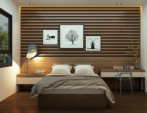 Thiết kế phòng ngủ khách nhà anh Nam – Hải Dương Nội thất phòng ngủ gây ấn tượng bởi những bức tường bằng gỗ lớn. Nội thất phòng ngủ gây