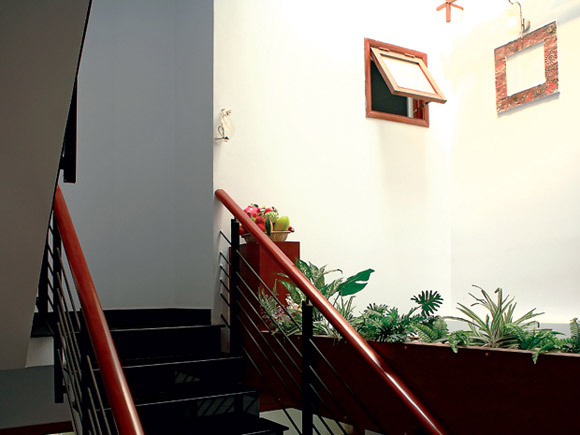 Nhà ông Lê Quang Mai ở quận 2 đã phải nhờ bên thiết kế làm thêmnhững bồn hoa bằng gỗ chạy kẹp theo cầu thang để giảm hẳn góc nhìn xuống giếng trời sâu hun hút khi đi lên xuống.